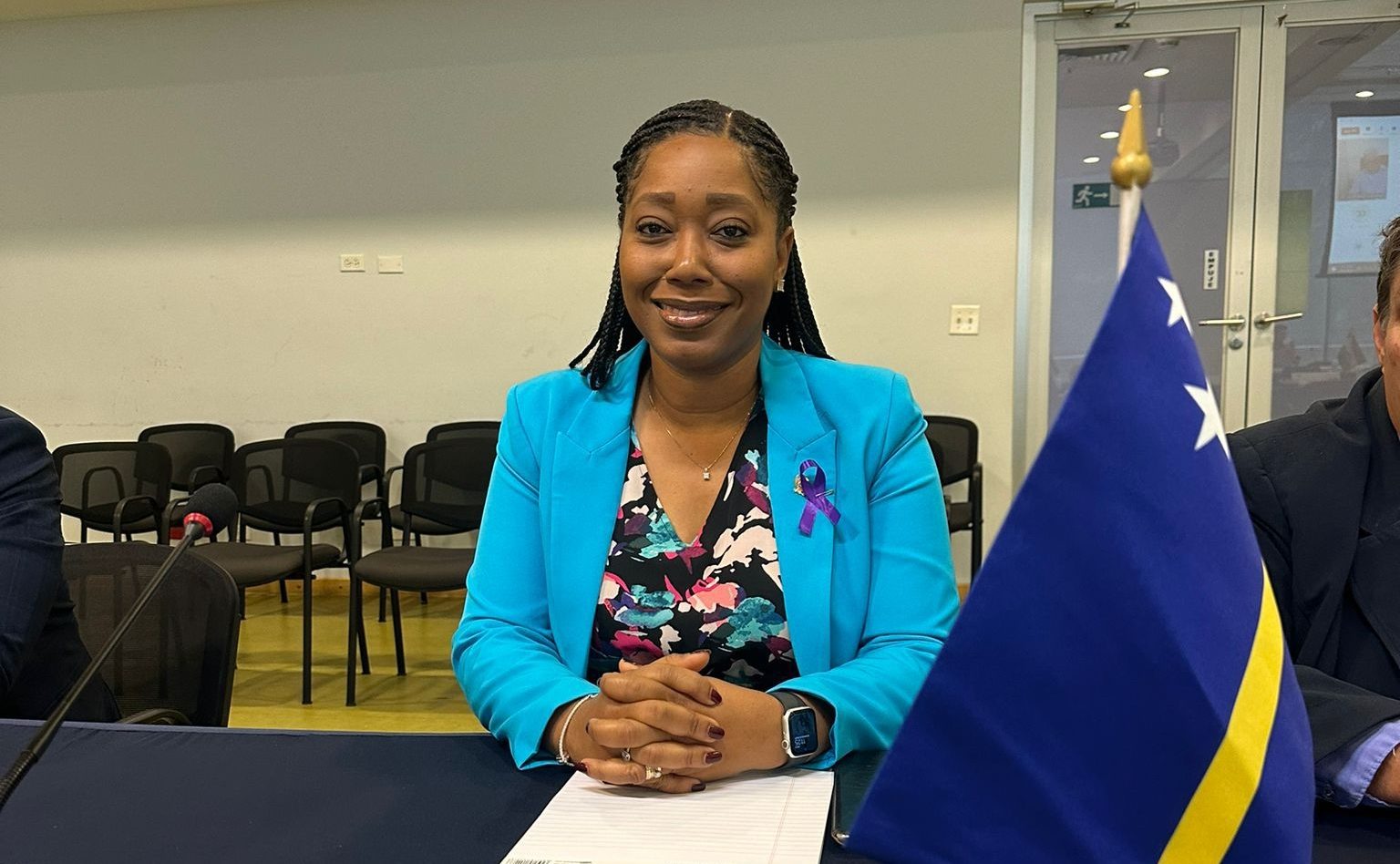 Djabièrnè 8 di mart 2024, Presidente di Parlamento, sra. Charetti America-Francisca a keda skohe komo miembro temporal di e direktiva diario di Parlatino durante e reunion general di hunta di direktiva i e visepresidente di e 23 paisnan ku ta presente.