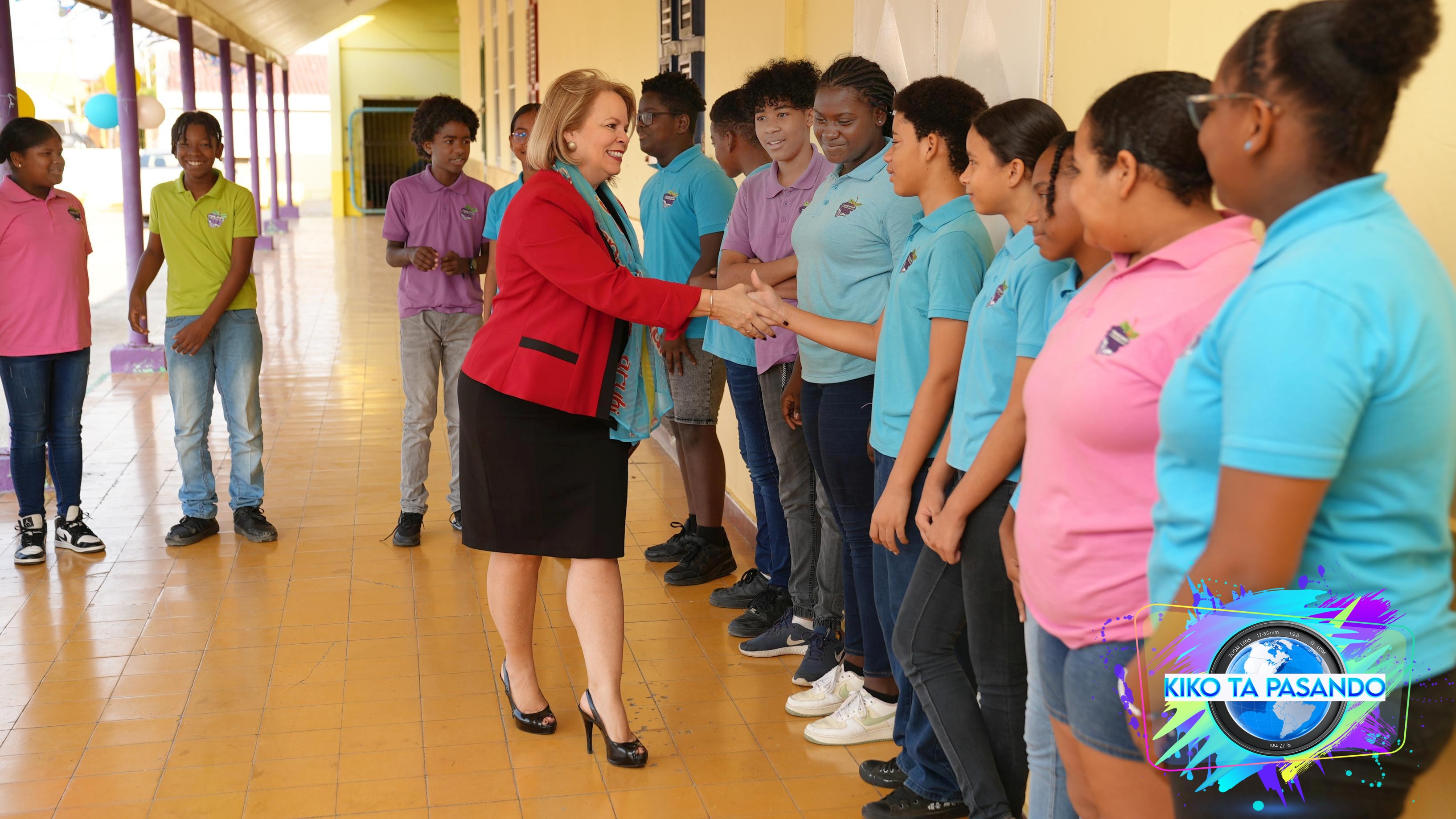 ORANJESTAD – Diahuebs mainta, Prome Minister Evelyn Wever-Croes a cuminsa su dia bishitando Graf von Zinzendorf School na San Nicolas en conexion cu dia di Himno y Bandera.