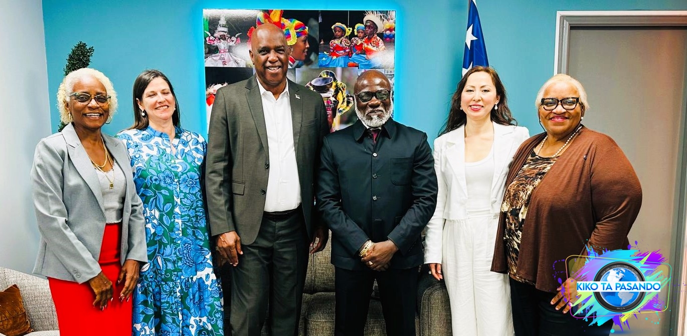 WILLEMSTAD – Den kuadro e di reunionnan di komishonnan nashonal di UNESCO di Karibe, Minister di Enseñansa, Siensia, Kultura i Deporte (ESKD) sr. Sithree van Heydoorn a risibí na su despacho e un parti di e delegashon ku ta na Kòrsou. E delegashon ta konsistí di Sra. Anna Paolini (Director UNESCO Field Office in Jamaica), sr. Anthony Ohemeng-Boamah (Assistant Director General for Africa and External Relations UNESCO) i sra. Assel Utegenova (Unit for UNESCO National Comissions).