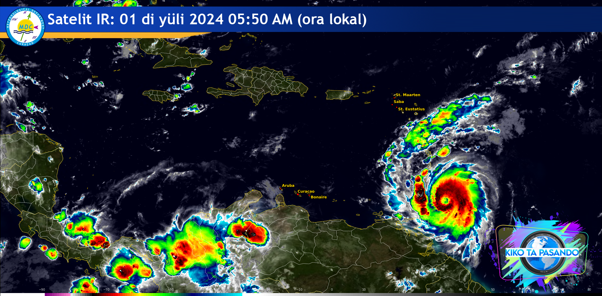 Sistemanan signifikante di wer tropikal: Siklon tropikal Beryl ta keda un orkan kategoria 4, na momentu ku e ta pasa riba e islanan den sùitost Karibe awe mainta tempran. Servisio Meteorológiko Kòrsou ta sigui monitoreá di aserka desaroyo di e orkan peligroso Beryl ku lo pasa na un distansia leu i salvo di e islanan ABC tempran riba djamars.