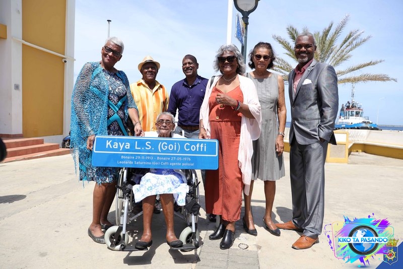 Riba djaweps, 15 di ougùstùs 2024, entidat públiko Boneiru a desvelá nòmber nobo di un kaya na honor di Leonardo Saturnino ‘Goi’ Coffi, un polis distinguí i kerí den nos komunidat den añanan ’50 di siglo pasá i mas. E kaya ku ta situá serka di Ofisina di Duana awor ta karga e nòmber “Kaya Leonardo Saturnino ‘Goi’ Coffi” komo rekonosementu pa su kontribushon na nos komunidat.