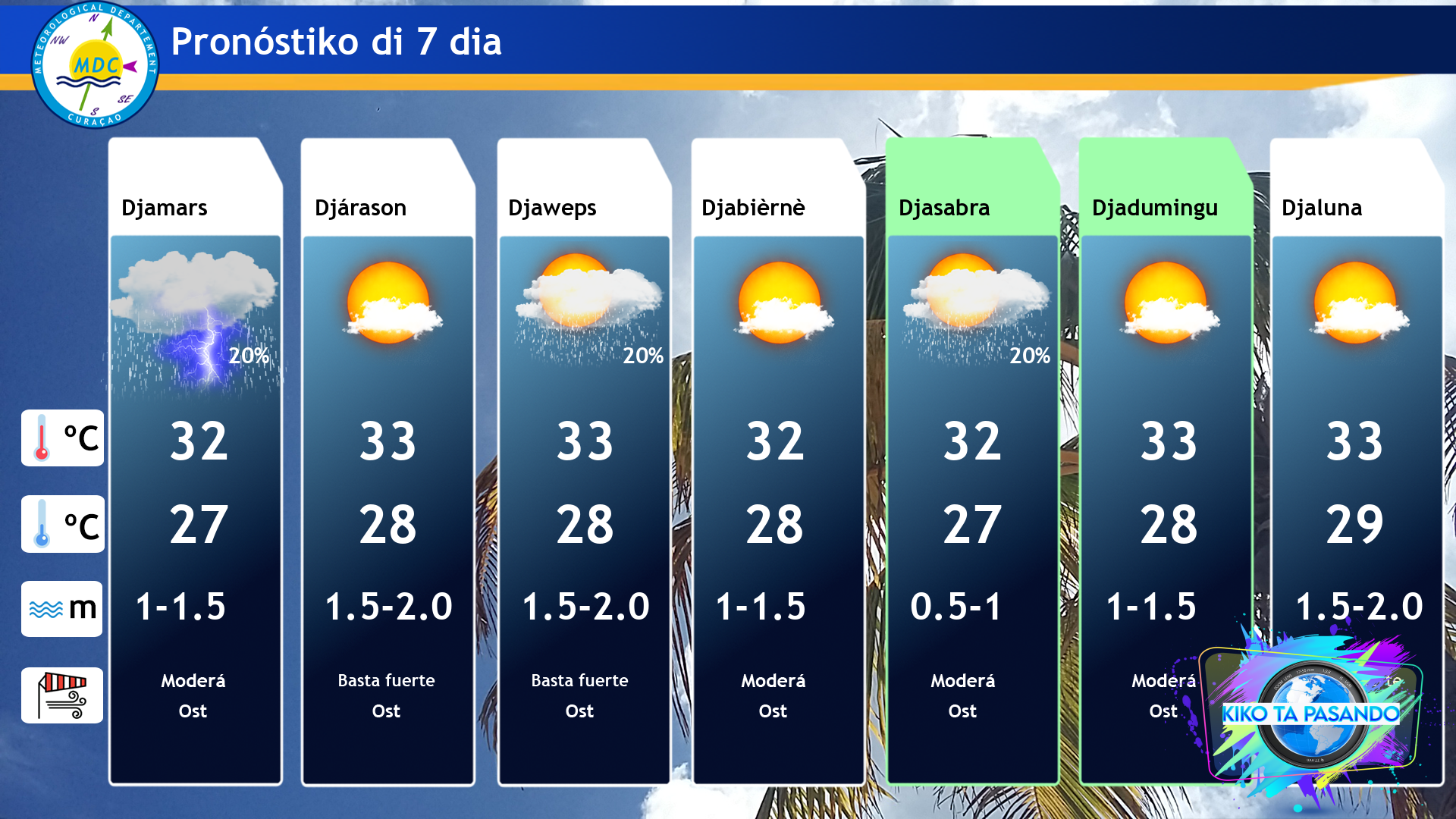Temperatura máksimo lo alkansá 33ºC i temperatura mínimo 27ºC.