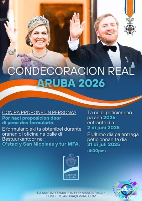 ORANJESTAD – E ultimo fecha pa entrega nominacion pa un distincion Real pa aña 2026 ta mañan, diahuebs, 31 di juli 2025, 4:00 PM.