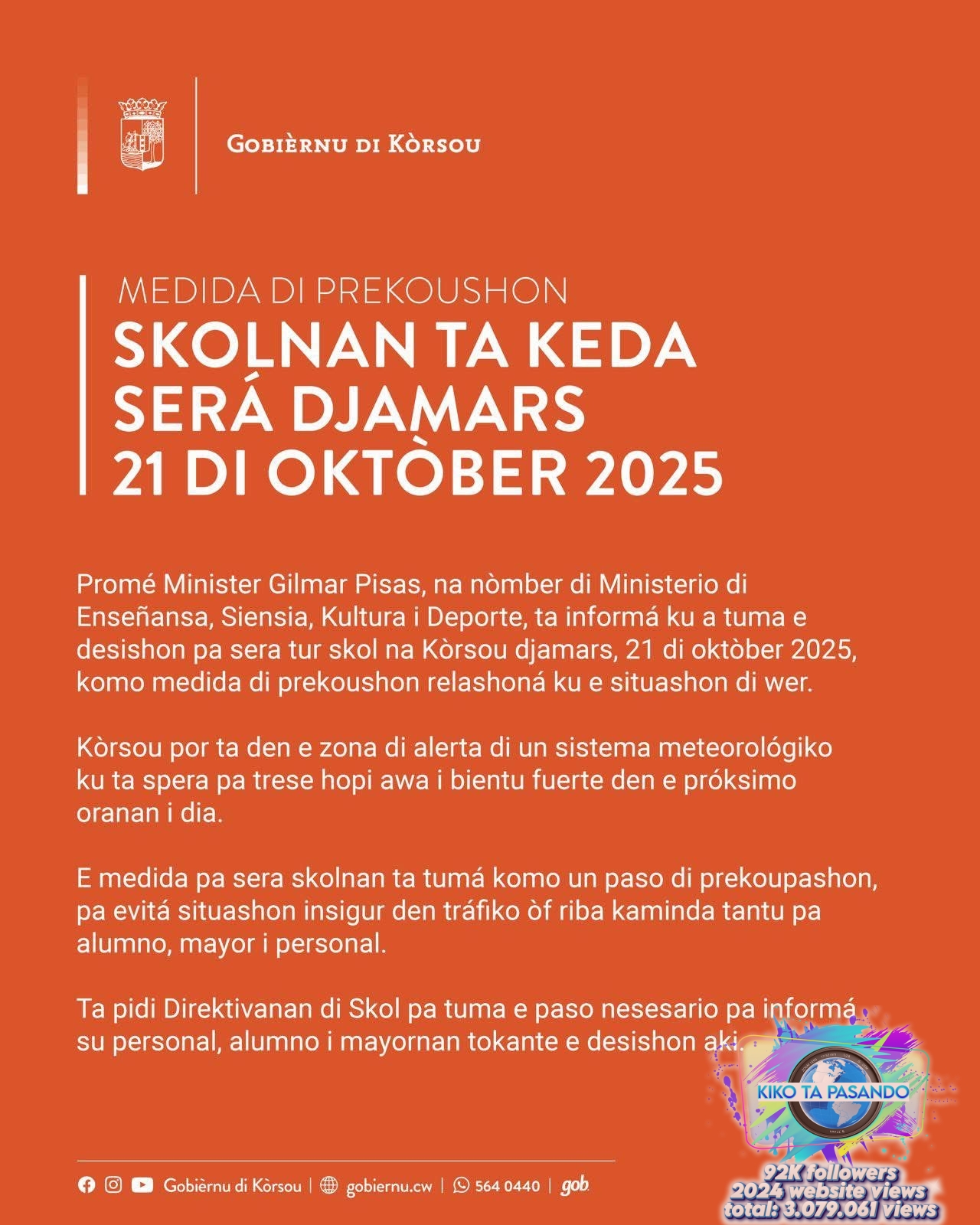 Willemstad, 20 di oktòber 2025 – Promé Minister Gilmar Pisas, na nòmber di Ministerio di Enseñansa, Siensia, Kultura i Deporte, ta informá ku a tuma e desishon pa sera tur skol na Kòrsou djamars, 21 di oktòber 2025, komo medida di prekoushon relashoná ku e situashon di wer. Despues di konsulta entre Servisio Meteorológiko di Kòrsou (Meteo), e Tim di Kordinashon di Krísis (Rampenbureau), i Minister-Presidènt Gilmar Pisas, i tambe a base di informashon di e National Hurricane Center, a keda determiná ku Kòrsou por ta den e zona di alerta di un sistema meteorológiko ku ta spera pa trese hopi awa i bientu fuerte den e próksimo oranan i dia.