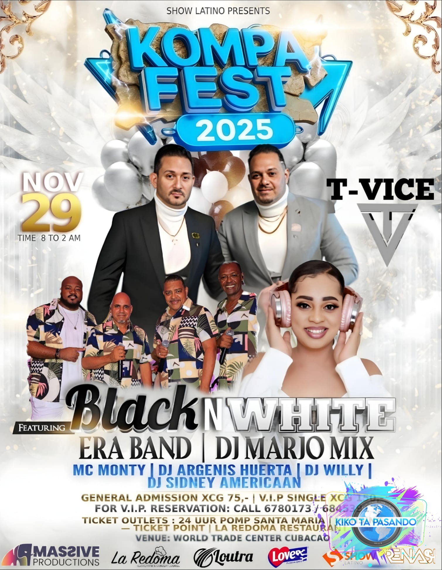Manera ya ta konosi, ku djasabra dia 29 di november 2025, di 8 or anochi te ku 2 or di marduga, den World Trade Center, ta bai tin pa prome bes aki na Korsou , un festival di Kompa titula, KOMPA FEST 2025, ku un di e mio banda Haitiano di aktualidad “T-Vice” i komo invitado special lo tei direktamente for di St. Maarten parti Frances, “Dj Marjorie Mix”.Esaki nan tur dos lo bai tei pa prome bes aki na Korsou, den un solo presentashon.