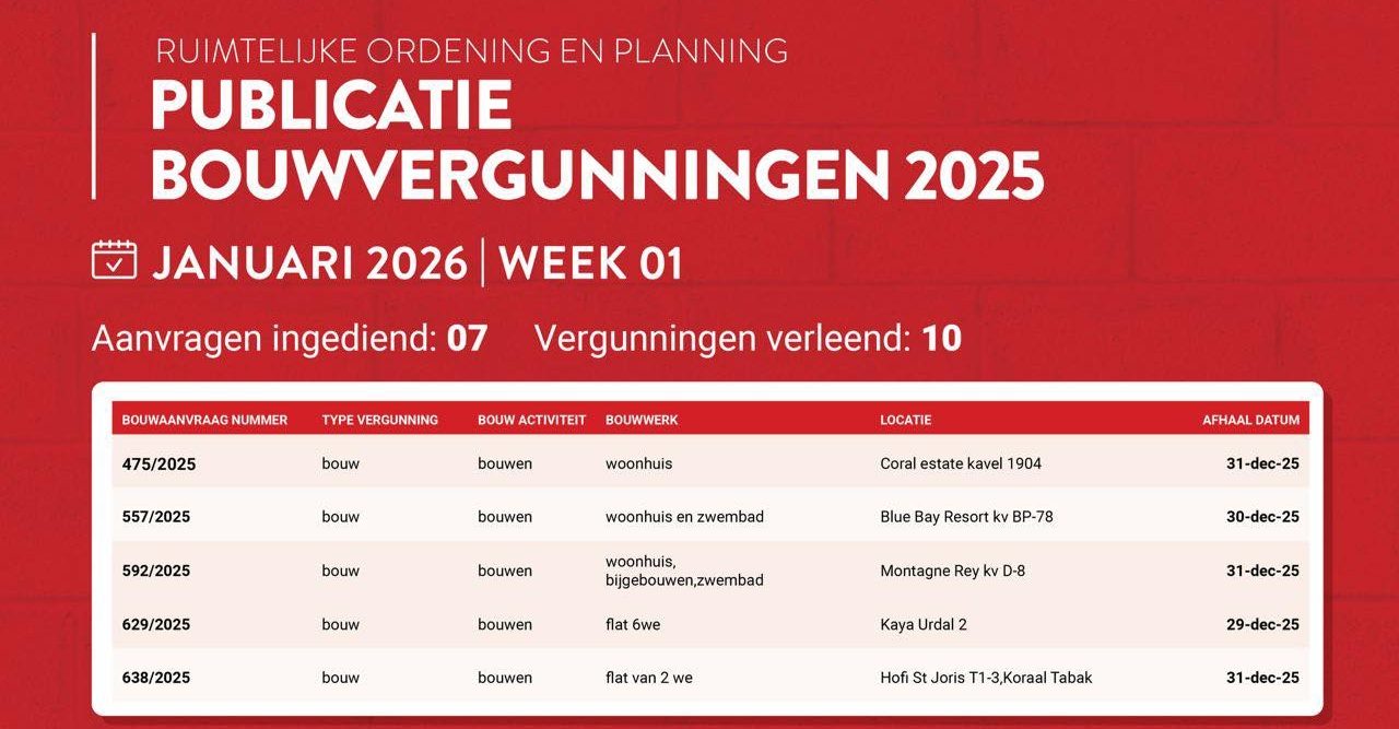 GOBIERNU Bouwvergunning 2026 January 13, 2026 REDAKSHON KOMPARTI E NOTISIA AKI VIA / Share the news Share on Facebook (Opens in new window) Facebook Share on WhatsApp (Opens in new window) WhatsApp Share on Telegram (Opens in new window) Telegram More Share on Reddit (Opens in new window) Reddit Share on Tumblr (Opens in new window) Tumblr Share on Pinterest (Opens in new window) Pinterest Like this:Like Loading... Related 639114718427035" 639114718427035" %d