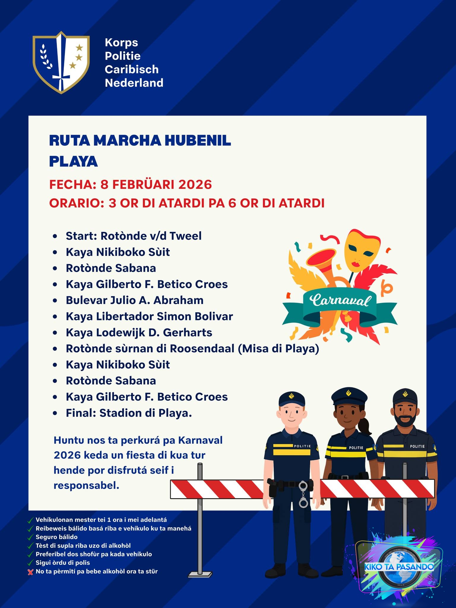 NOTISIA POLISIAL Rutanan di marcha hubenil 2026 na Rincon i Playa February 5, 2026 REDAKSHON Korps Politie Caribisch Nederland – KPCN Rutanan di marcha hubenil 2026 na Rincon i Playa Kuerpo Polisial Hulanda Karibense ta deseá un i tur un felis karnaval! KOMPARTI E NOTISIA AKI VIA / Share the news Share on Facebook (Opens in new window) Facebook Share on WhatsApp (Opens in new window) WhatsApp Share on Telegram (Opens in new window) Telegram More Share on Reddit (Opens in new window) Reddit Share on Tumblr (Opens in new window) Tumblr Share on Pinterest (Opens in new window) Pinterest Like this:Like Loading... Related 639114718427035" 639114718427035" %d