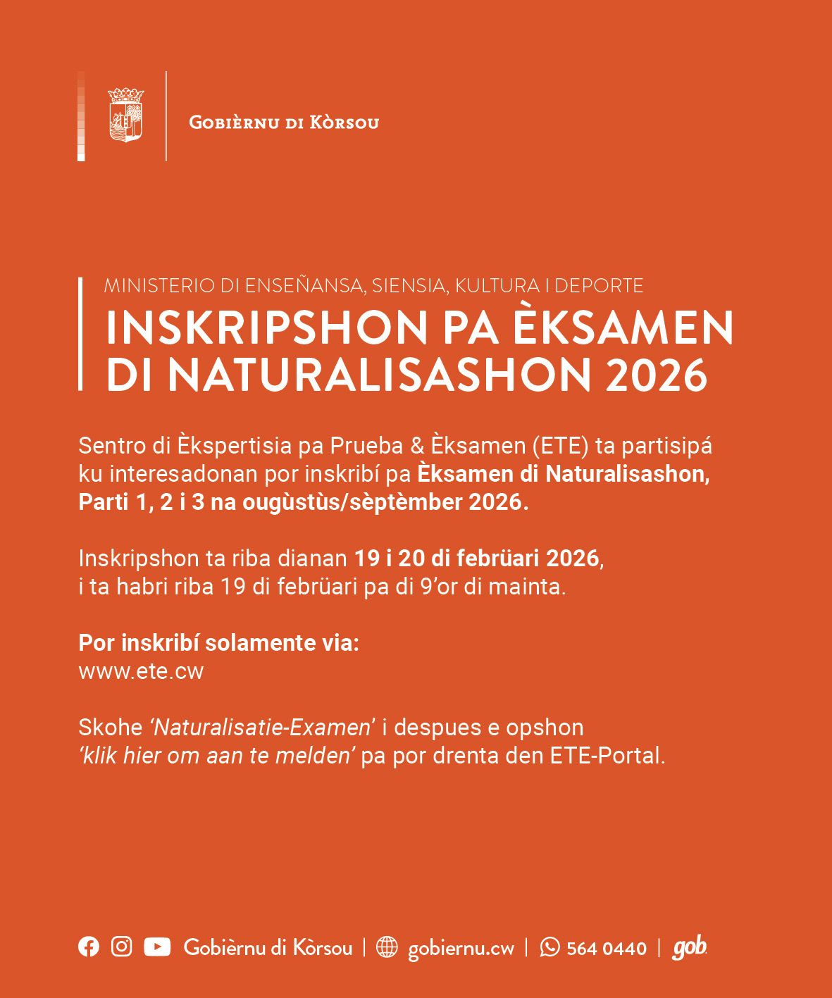 Inskripshon ta habri 19 i 20 di febrüari 2026, for di 9’òr di mainta. Inskripshon eksklusivamente via www.ete.cw. Skohe ‘Naturalisatie-Examen’ i klik pa drenta den ETE-Portal.