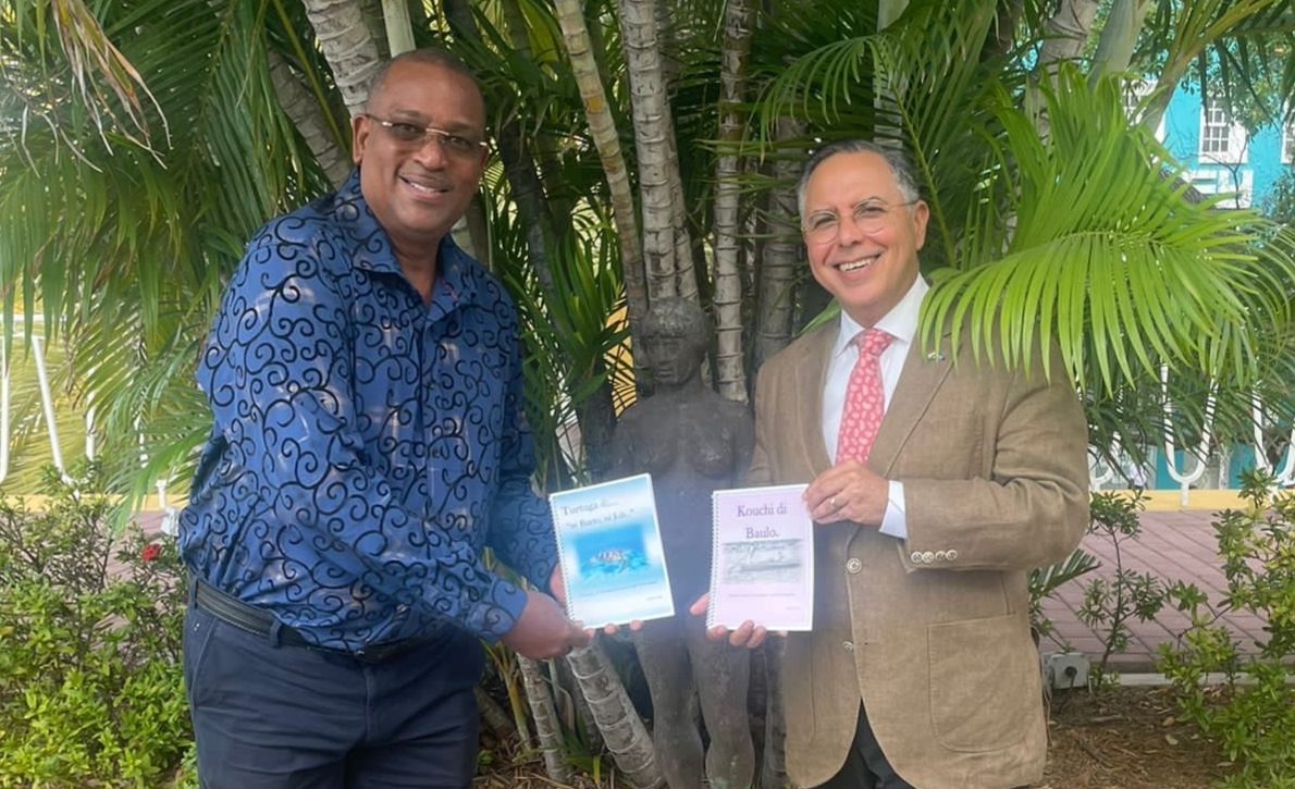 Tijdens het bezoek heeft dhr. Scoop een exemplaar van zijn uitgaven “Turtuga di… Ni Barto, ni Job” en “Kouchi di Baulo” aan de Gouverneur overhandigd.