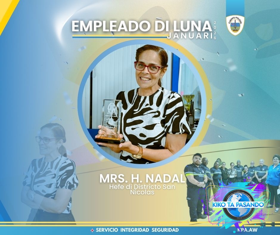 NOTISIA POLISIAL Korps Politie Aruba EMPLEADO DI LUNA JANUARI 2026 February 23, 2026 REDAKSHON Korps Politie Aruba EMPLEADO DI LUNA JANUARI 2026 Sra. Nadal Hefe di Districto San Nicolas ta bira e prome empleado di luna pa Januari 2026. Masha pabien! di parti e famia blauw di Cuerpo Policial Aruba KOMPARTI E NOTISIA AKI VIA / Share the news Share on Facebook (Opens in new window) Facebook Share on WhatsApp (Opens in new window) WhatsApp Share on Telegram (Opens in new window) Telegram More Share on Reddit (Opens in new window) Reddit Share on Tumblr (Opens in new window) Tumblr Share on Pinterest (Opens in new window) Pinterest Like this:Like Loading... Related 639114718427035" 639114718427035" %d