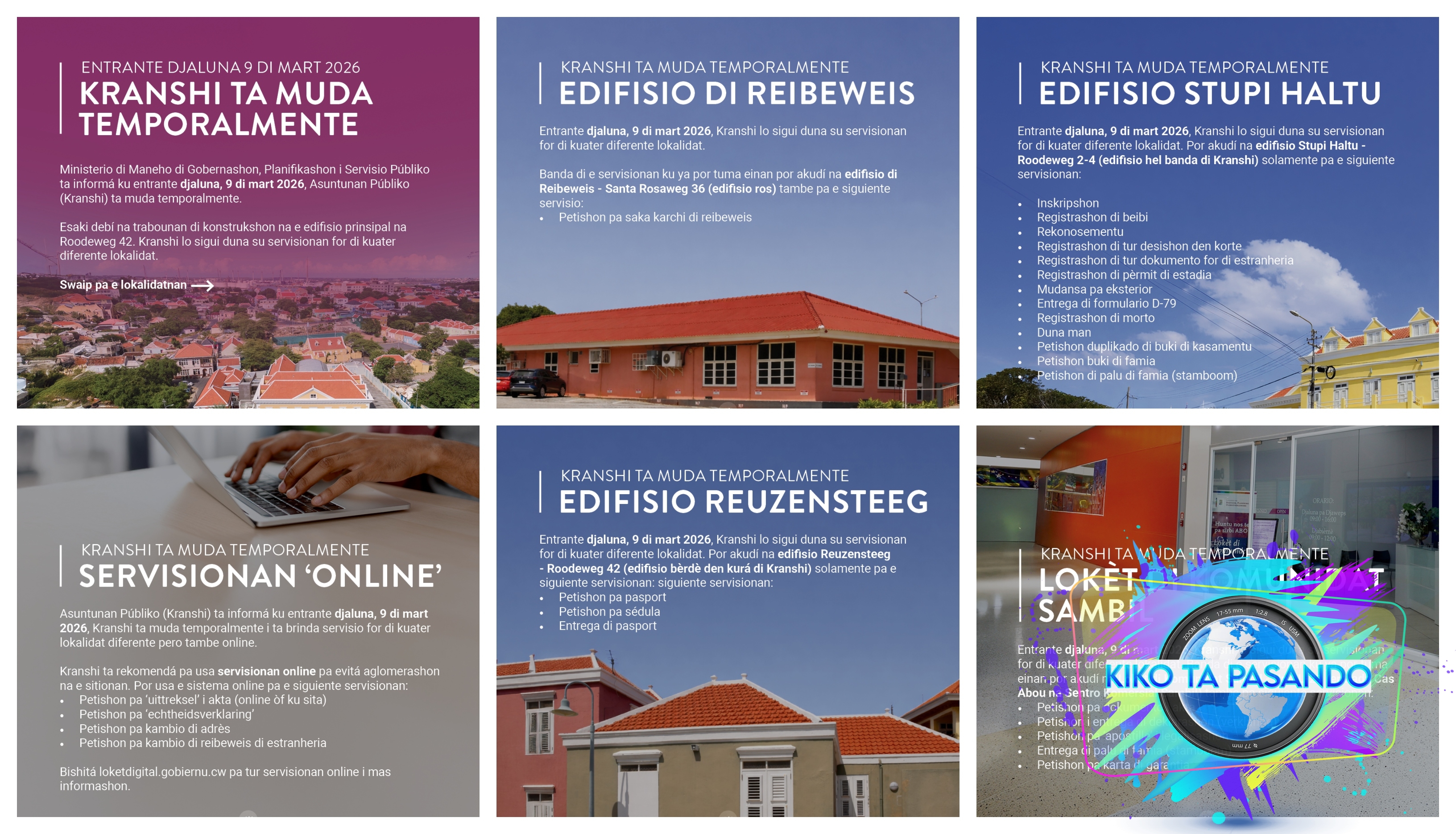 Gobièrnu di Kòrsou [TUMA NOTA]: Entrante djaluna, 9 di mart 2026, Asuntunan Públiko (Kranshi) lo muda temporalmente.