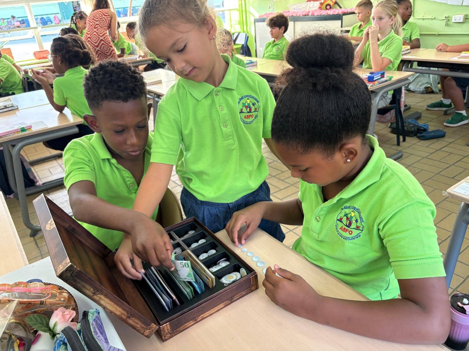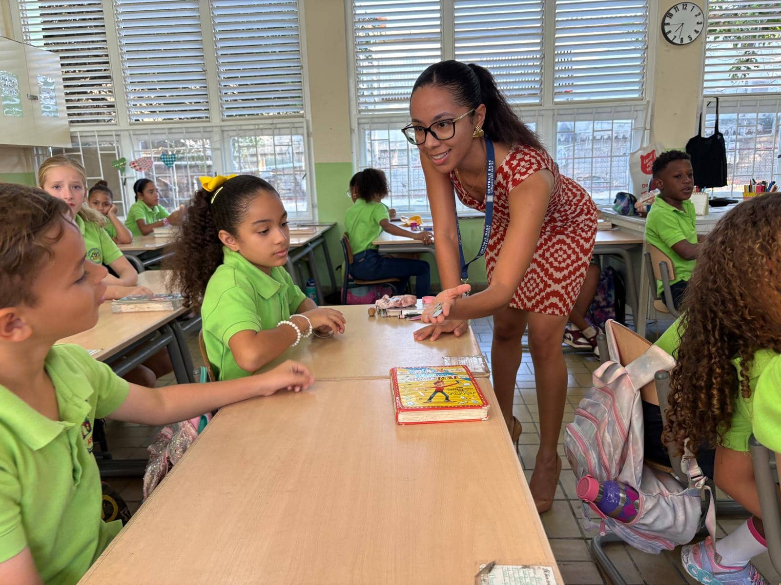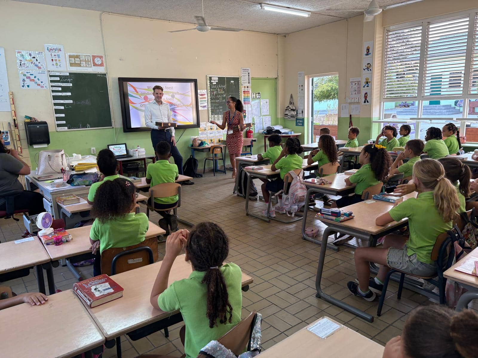 Kon nos florin ta wòrdu yamá? Bo por mira e diferensia entre e 1 i e 5 florin karibense? Kuantu bo ta sobra si bo gasta 50 florin den e tienda di ko’i hunga i tambe kumpra algu chikitu pa bo ruman chikitu pa 20 florin? Esaki tabata algun di e preguntanan ku e alumnonan di Grupo 5 na Albert Schweitzer Foundation Education a risibí di Stefan Riezebos, trahadó di maneho na Representashon di Hulanda na Willemstad (VNW), i Shekinah Dare di Banko Sentral di Kòrsou i Sint Maarten (CBCS). Stefan i Shekinah a para dilanti di e klas komo parti di Siman di Plaka pa papia ku e alumnonan tokante plaka na un manera aksesibel i interaktivo. E muchanan tabata hopi enbolbí den e lès i a wak e plaka ku hopi interes, spesialmente ora nan a haña pèrmit pa analisá e biyetenan real di 200 florin di aserka.
