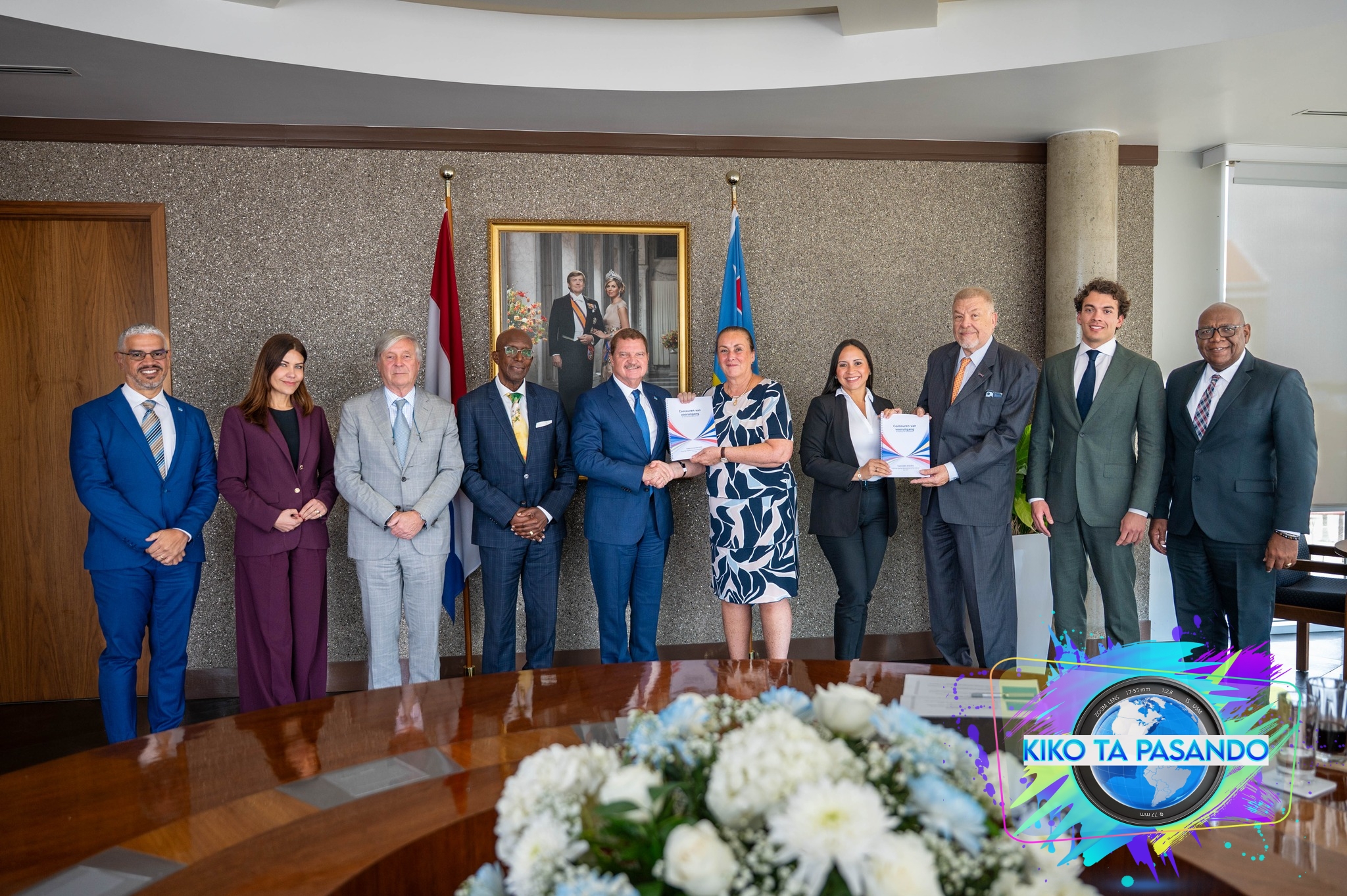 Prome Minister Mike Eman, acompaña pa Minister Gerlien Croes, Secretario General Robert Candelaria y como tambe e grato presencia di ex-Minister Angle Bermudez, kende actualmente ta forma parti di e comision, caminda a ricibi awe e Comision di Evaluacion, kende a presenta formalmente e informe final di evaluacion intermedio di e Onderlinge Regeling Samenwerking bij Hervormingen (ORSH), hunto cu otro rapportnan di investigacion.