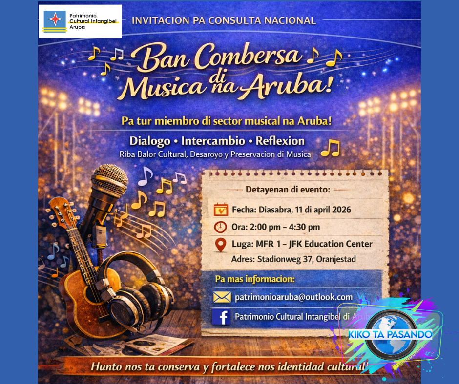 ORANJESTAD, 2 di april 2026: Comision Nacional Patrimonio Cultural Intangibel Aruba (PCI) ta invita tur miembro di e sector musical na Aruba pa participa den un consulta nacional cu lo enfoca riba e tema: “Ban Combersa di Musica na Aruba’.