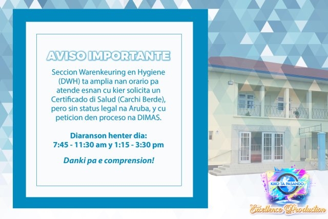 ORANJESTAD – Departamento di Salud Publico su seccion Warenkeuring en Hygiene (DWH) ta informa cu nan a introduci un orario special pa atende cu personanan cu ta solicita un certificado di salud (carchi berde) pero cu no tin status legal na Aruba, y cu nan peticion ta actualmente den proceso na DIMAS.